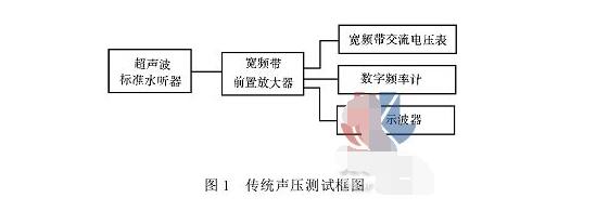 標(biāo)準(zhǔn)水聽(tīng)器經(jīng)過(guò)校準(zhǔn),它能將作用在它上面的聲壓轉(zhuǎn)換成相同頻率及波形的交流電壓信號(hào),此電壓信號(hào)與聲壓的強(qiáng)度成正比。當(dāng)將該水聽(tīng)器插入受超聲波作用的液體介質(zhì)中時(shí),它就有一電壓信號(hào)輸出。經(jīng)前置放大器不失真放大后,送入交流電壓表。數(shù)字頻率計(jì)同時(shí)測(cè)得超聲波的頻率,示波器可隨時(shí)監(jiān)視信號(hào)電壓波形的變化。這一測(cè)量方法已被普遍采用了。